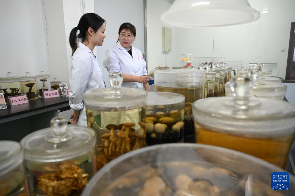 孙淑静教授(右)在福建农林大学(古田)菌业研究院向研究生介绍银耳新品种研究情况(2025年9月26日摄)。新华社记者林善传摄
